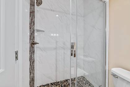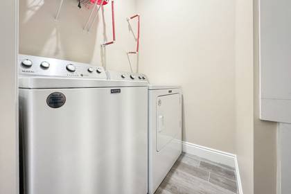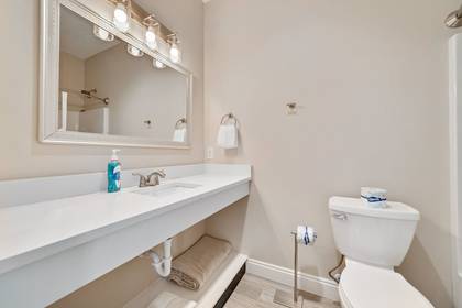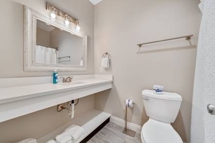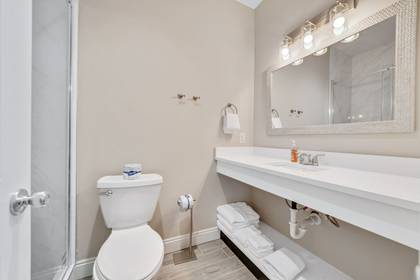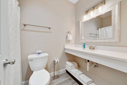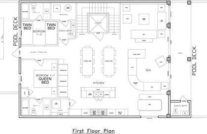 1st floor: Living & Dining Areas, Kitchen, Half Bath, Laundry, Queen Bedroom with Private Bath, Bunk Bedroom (2 twin bunk beds, sleeps 4) with Private Bath