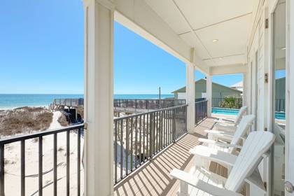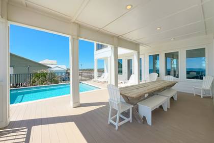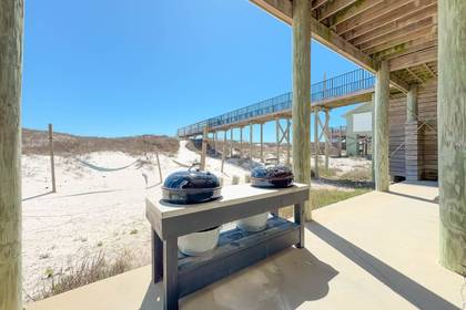 All 3 levels have gulf front porches. On the main level porch you'll enjoy outdoor dining and seating as well as your private heated pool. Underneath you find swings, a big grill, a long picnic table and more shaded seating and outdoor living space.