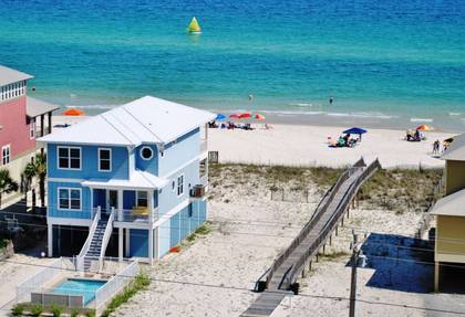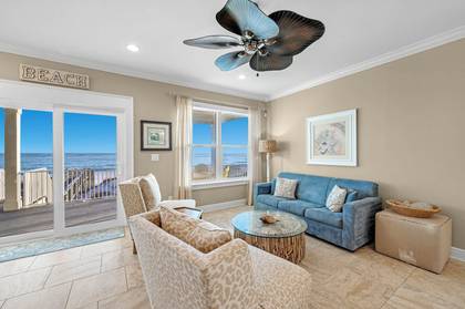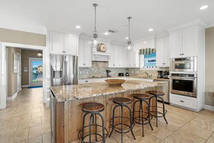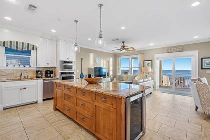 Sea Blue is an amazing beachfront home with gracious spaces and beautiful furnishings and a private pool. The real surprise is the inside! The spacious great room has seating for everyone, a dining table you'll want to gather around, and an amazing kitchen complete with a view of the beach.
