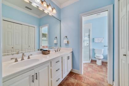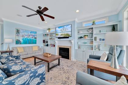 The main floor has the great room with a large HDTV over the fireplace, a well-equipped kitchen with great beach views for the cooks, and a dining table with benches and chairs plus stools at the kitchen island to seat the entire family. You'll also find outdoor dining and seating on the porch. This floor has a king bedroom with a private bath, a bedroom with a pair of queens and a bath that also opens to the hall, and the laundry.