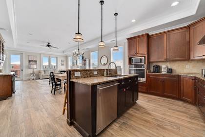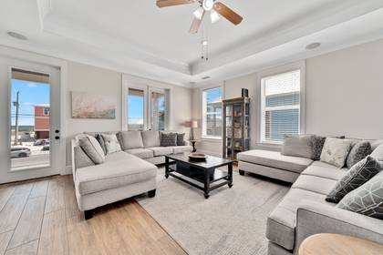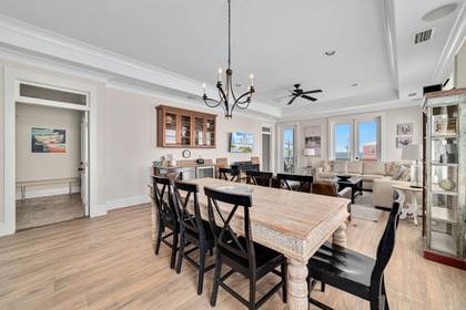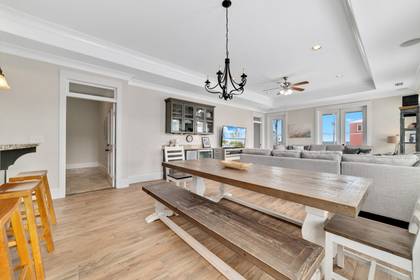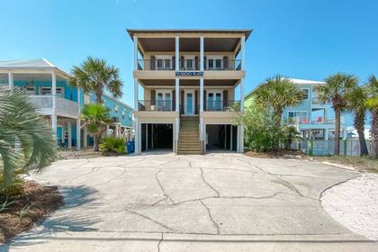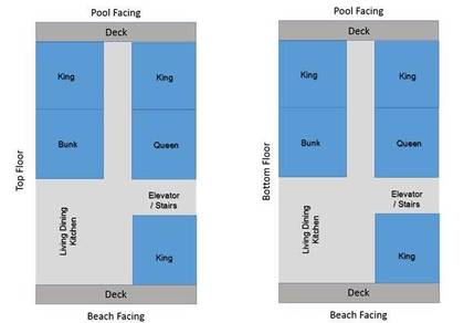 Tuxedo Flats is a 10 bedroom, 10 full and 2 half bath home conveniently located just across from the 12th Street beach access. Each of the 2250 square foot floors has 5 bedrooms, 5.5 baths plus a living and dining area a full kitchen and a wet bar, plus porches on both the beach and pool sides of the house. There are stairs and an elevator connecting the floors, and you can close the doors to the stairs to increase privacy between the two levels if you wish.