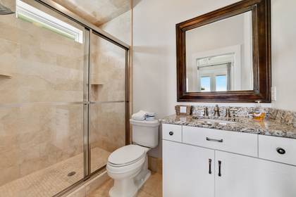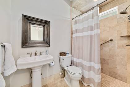 Connecting large front and back decks enhance the beach views and lagoon features - perfect for a quiet read or afternoon cocktails. Headed to the beach? You'll find convenient access right across the street along with a convenient outdoor shower. Finish your day in the oasis-like backyard complete with two pools, a smaller one (8'x10') that can be heated October-May for $60 per day, and a larger one (18'x24') that is great for cooling off in warm weather, a covered gazebo and hammock. In the covered breezeway you'll find a shaded ping-pong table and hammock chairs.