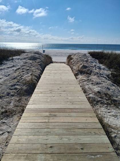 Below the house you'll find the splash pool sheltered under the house and surrounded by vines and flowers. It is a wonderful break from the sun when it is really hot in summer, but in cooler months is heated and sheltered from the wind--your own little oasis. You'll also find a hot and cold water shower and changing room under the house, a grill, sand chairs, and a dune walkover.