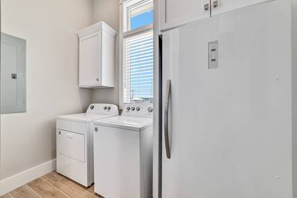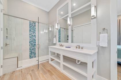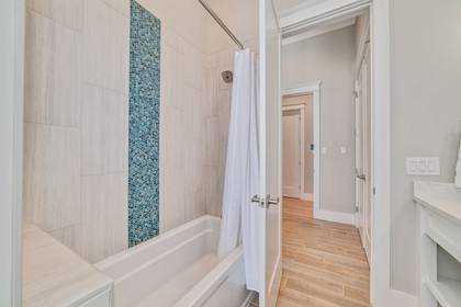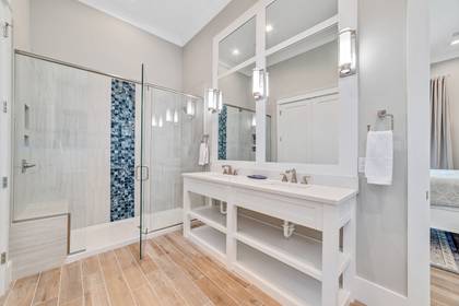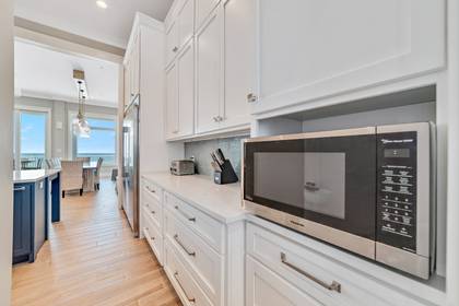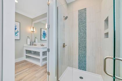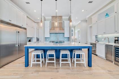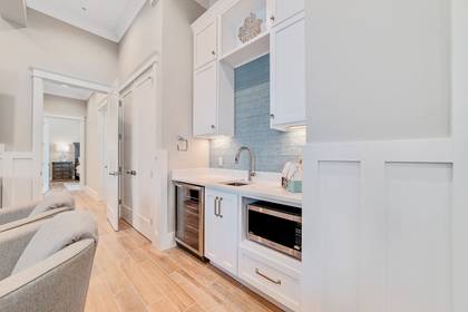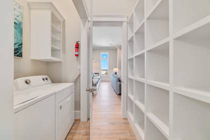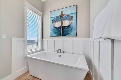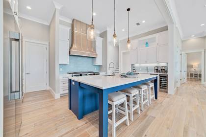 The main floor of Aqua Therapy features a spacious great room and a well-equipped kitchen with high-end appliances, including a huge refrigerator, twin ovens with eight burners, a bar with a second sink, an undercounter ice machine, a wine fridge, a beverage fridge, an island with seating, and a large pantry. This level also includes two beachfront primary King bedrooms, each with an ensuite bath featuring a soaking tub, a separate shower, and ample vanity space. The east bath is handicap accessible, with a low shower threshold that is roll-in able. Additionally, there is a cozy lagoon-view nook with a daybed and a full bath next to it, as well as one of the three laundry rooms, which includes an additional refrigerator and a commercial ice machine.