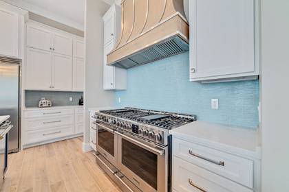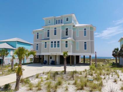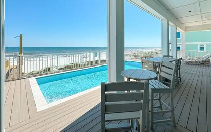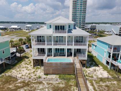 Aqua Therapy is an exceptional new beachfront luxury home located in the West Beach area of Gulf Shores, just four miles west of the intersection of Hwy 59 and Beach Blvd. This stunning property boasts eight bedrooms and nine bathrooms, featuring a large private pool that can be heated from October to May for an additional $60 per day, and an elevator. The custom details throughout the home include 12-foot ceilings, 10-foot beachfront glass doors, and porches on all three levels.