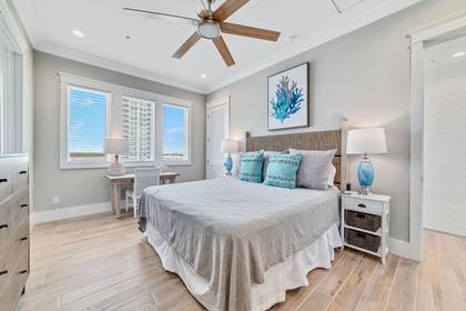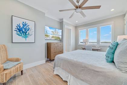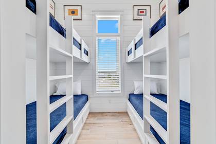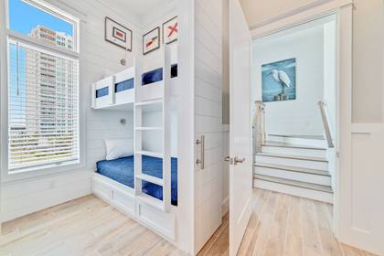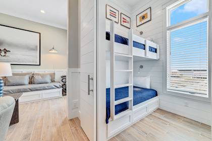 The middle floor offers a large family room complete with a wet bar and plenty of seating, including two built-in daybeds that can double as extra sleeping space or an extra-long sofa. This floor also has two more primary King bedrooms mirroring the ones on the main floor, another beachfront King bedroom with glass doors opening to the porch and a private bath, a bunkroom with four XL twin beds and privacy doors, a second laundry room, and a full hall bath.