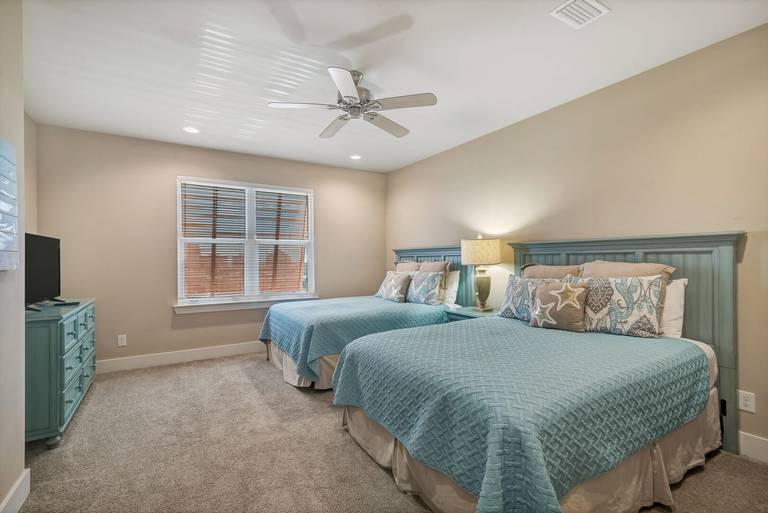 The top floor features a King primary suite with a private balcony and deluxe bath, including a double vanity, large tub, and separate shower. Additionally, there is another King Bedroom and two bedrooms, each with a pair of Queen beds. The upstairs landing offers a seating area with a television for added relaxation space.