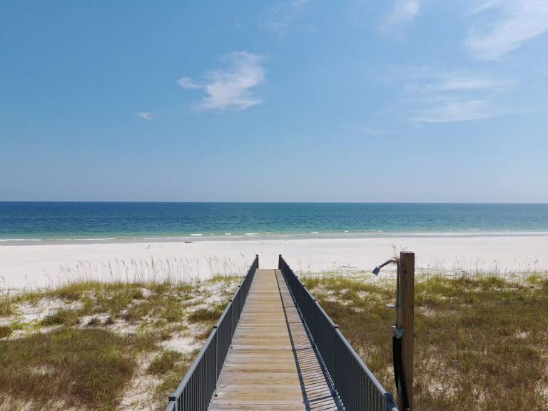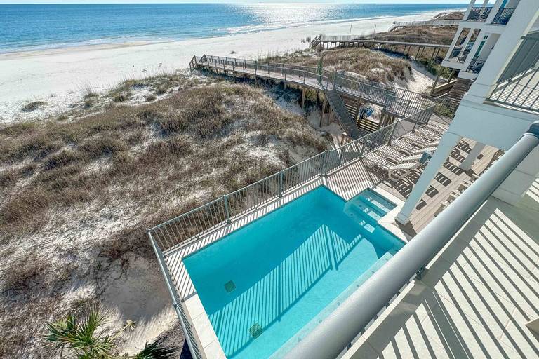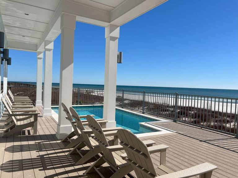 The beachfront porch has a 13'x19' private heated pool. You'll also find outdoor seating and dining, an outdoor shower, and under the house, a charcoal grill and beach chairs to take to the beach. Morning Breeze is located in the West Beach area of Gulf Shores, 5.4 miles west of the intersection where Gulf Shores Parkway ends at Beach Boulevard. Sorry, Morning Breeze is not available for events (including bachelor and bachelorette parties), or groups under the age of 25.