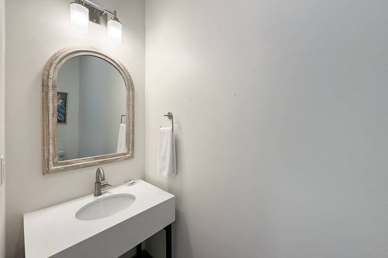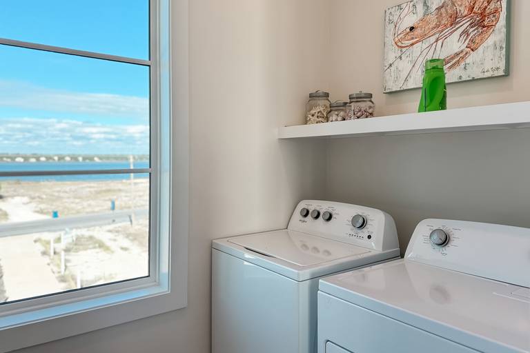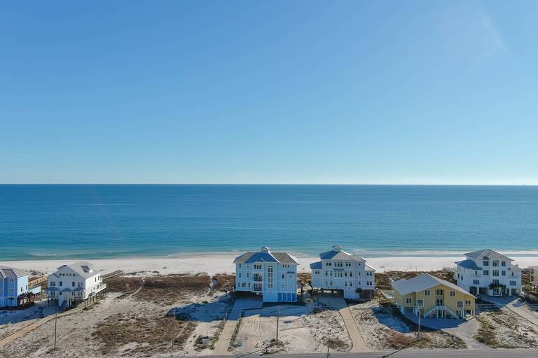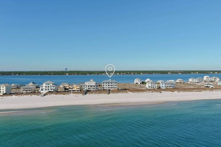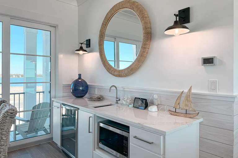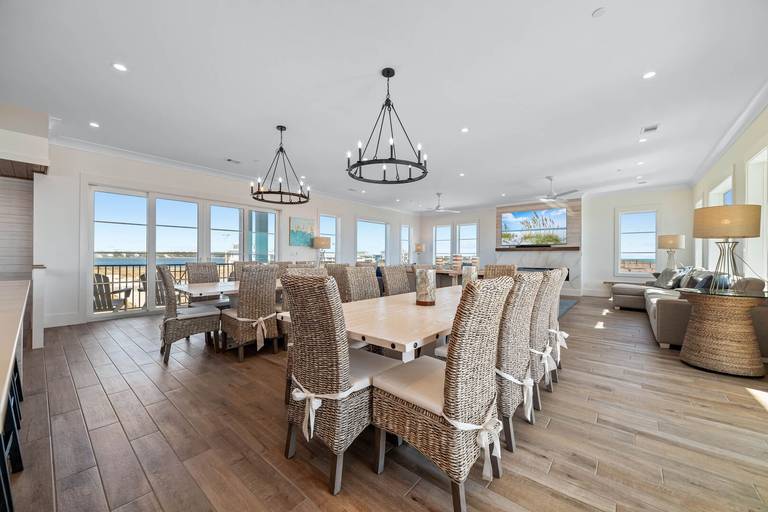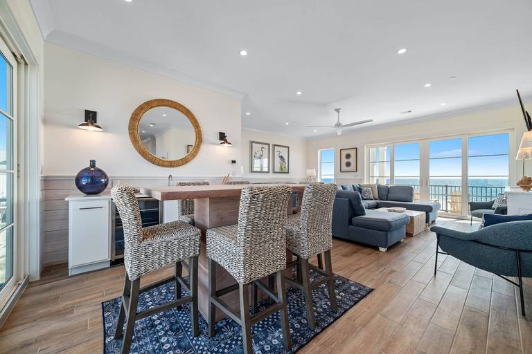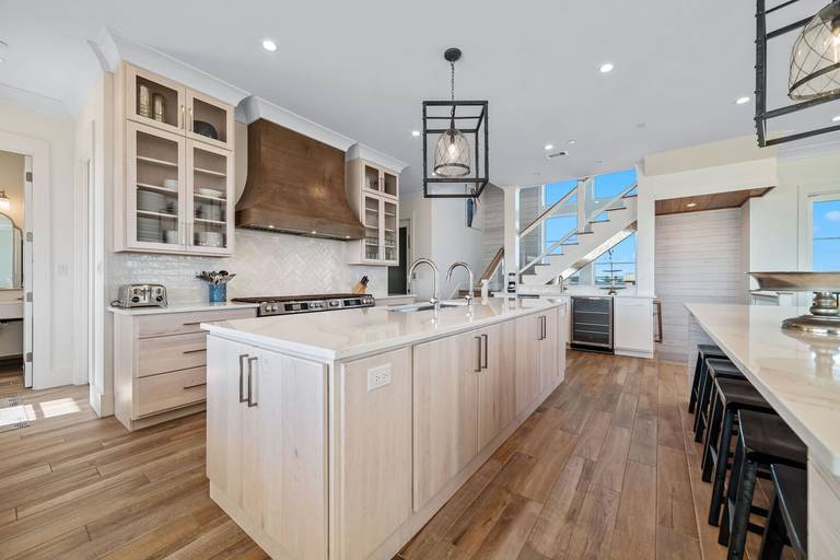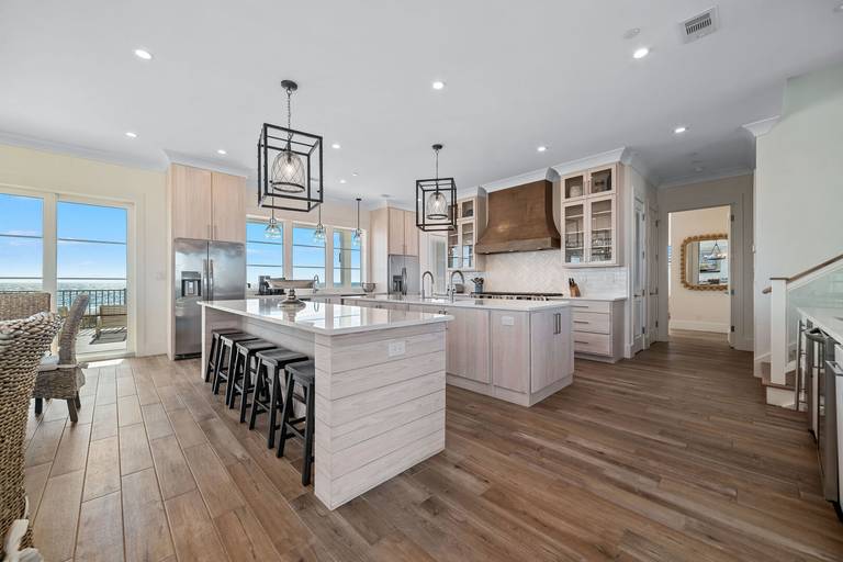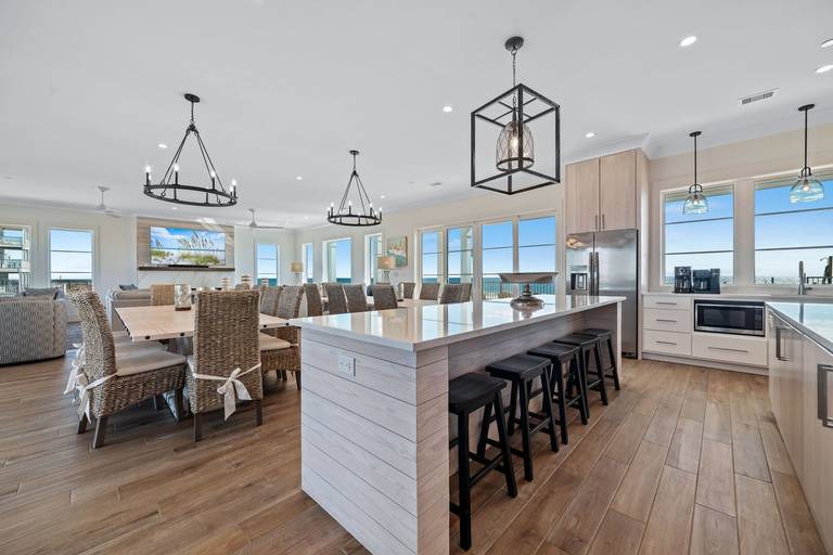 The main floor features a large living area with 180 degree views spanning from the Gulf to Little Lagoon., a 16' long dining table to seat a crowd, a spacious kitchen with 2 refrigerators, 2 ranges, 3 dishwashers, 2 sinks and lots of counter space with 1 large islands. There is a nearby wet bar with an undercounter icemaker, a beverage fridge and more. You'll find a large pantry/laundry, a half bath and the beachfront primary King bedroom complete with doors out to the covered porch and a lovely handicap accessible bath featuring a double vanity and separate tub and shower.
