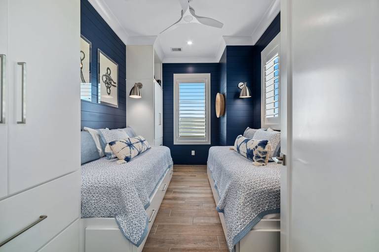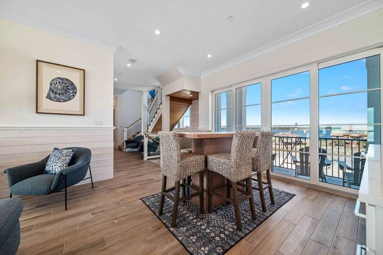 The middle floor has a large family room, a total of 4 bedrooms (3 Kings, 1 pair of Queens) plus a bunkroom with 2 XL twins, 5 full baths and a laundry room. It opens to porches on the beach and lagoon sides.