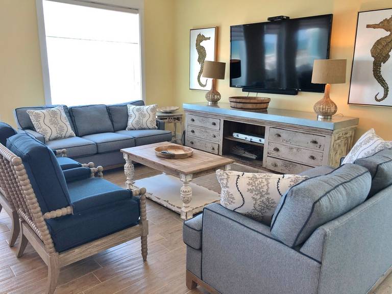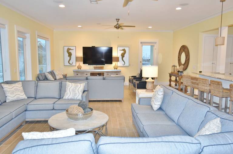 The living room opens to a Gulffront porch with a pool, and a dune walkover to the beach. The large kitchen is equipped for multiple cooks with 2 sinks, 2 refrigerators, 2 stoves, 3 dishwashers, an undercounter icemaker and more. There is a nearby wet bar with another undercounter icemaker, room for you to set up refreshments, and more. You'll also find a large laundry room and pantry on this level.