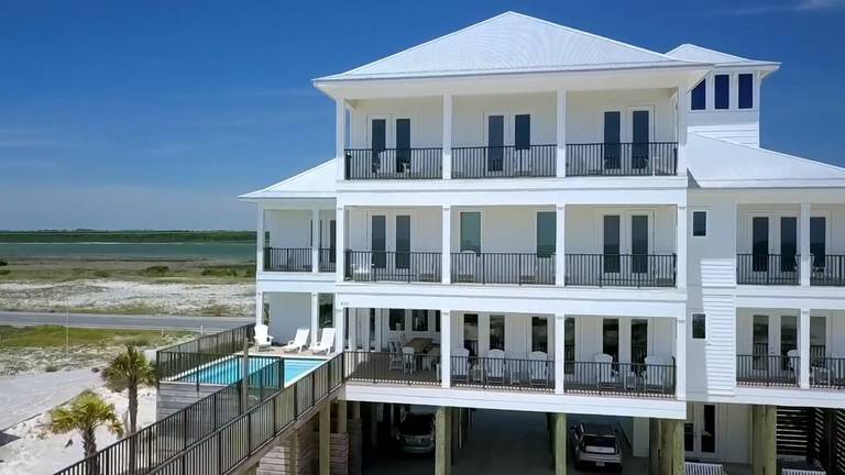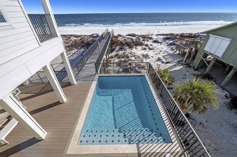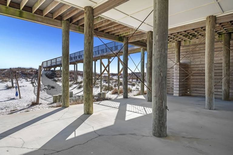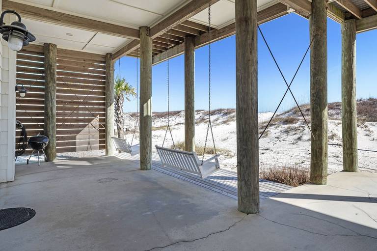 All 3 levels have gulf front porches. On the main level porch you'll enjoy outdoor dining and seating as well as your private heated pool. Underneath you find swings, a big grill, a long picnic table and more shaded seating and outdoor living space.