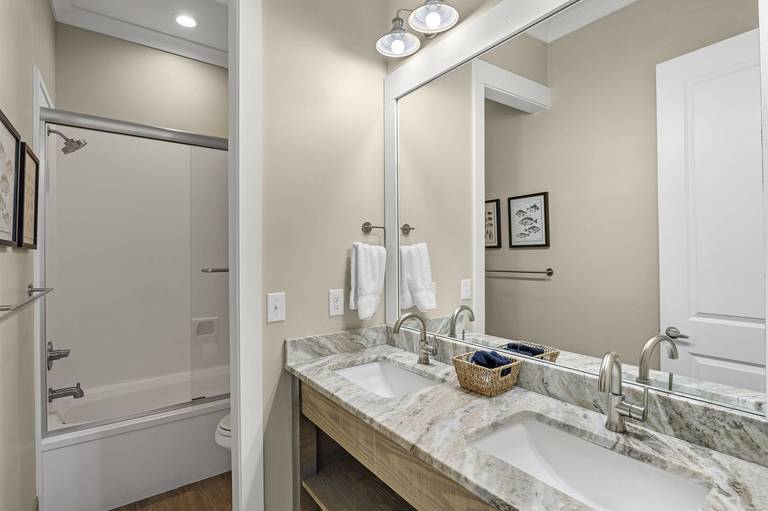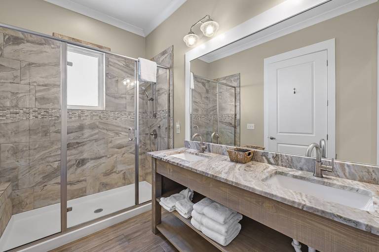 The main floor features a large living and dining spaces, a serious kitchen, a laundry, a pool bath, plus a King bedroom with a private bath. The middle level has 4 bedrooms (1 King, 3 that each have a pair of Queens), a laundry, and a family room. We also squeezed in 2 twin built-in bunks with curtains that close to offer privacy and an extra full bath. The top floor has 3 bedrooms (2 Kings, 1 with a pair of Queens) and a large game room with a wet bar and half bath.