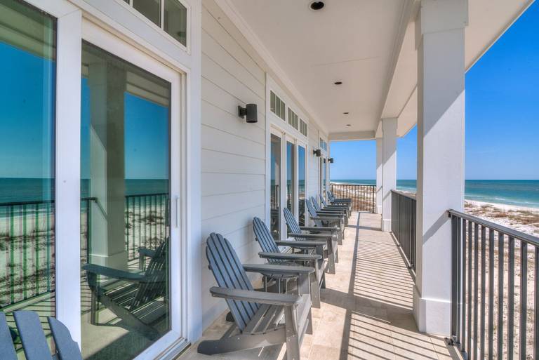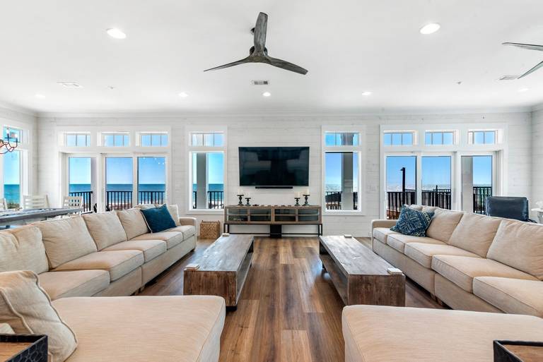 The middle floor has 4 bedrooms (2 Kings, 2 that each have a Pair of Queens). All open to beachside porches. The West King on this floor has a handicap friendly bath (right by the elevator). The family room on this level has multiple seating areas, a big TV, and amazing floor to ceiling views that span from the Gulf to the south to Little Lagoon on the north. Each bedroom has a private bath. You'll also find an extra full bath in the hall plus a laundry.