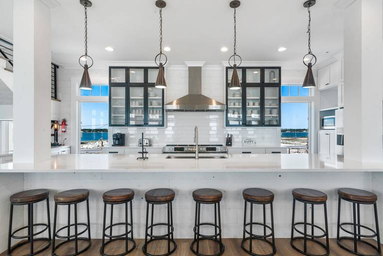 The main floor is breathtaking. Floor to ceiling windows with a large porch. The kitchen area on the main floor is beautiful. There is plenty of space to cook and entertain a large family. We absolutely loved the long dining table.
