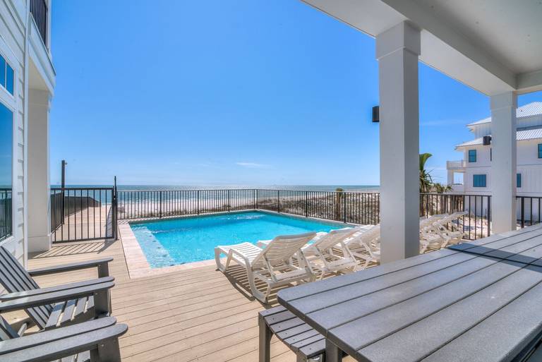 The main floor porches offer outdoor dining, seating, your private heated pool, and a dune walkover to the sugar-white Gulf Shores beach. Underneath you find a big grill, a long picnic table and more shaded seating and outdoor living space.