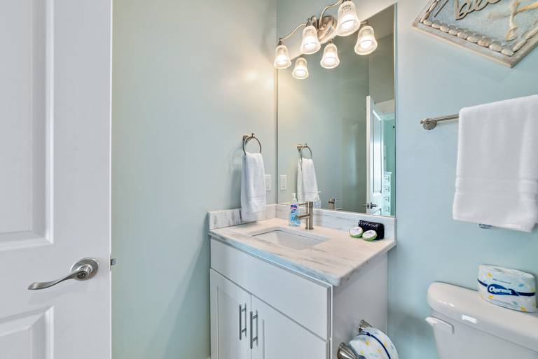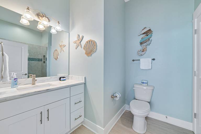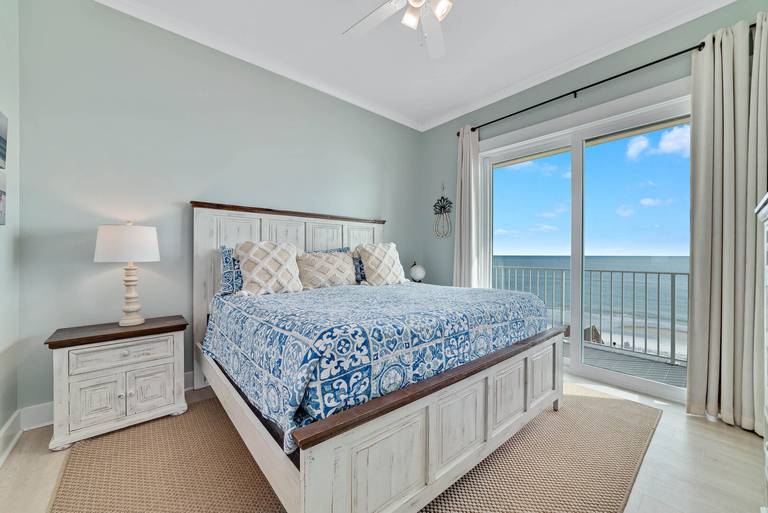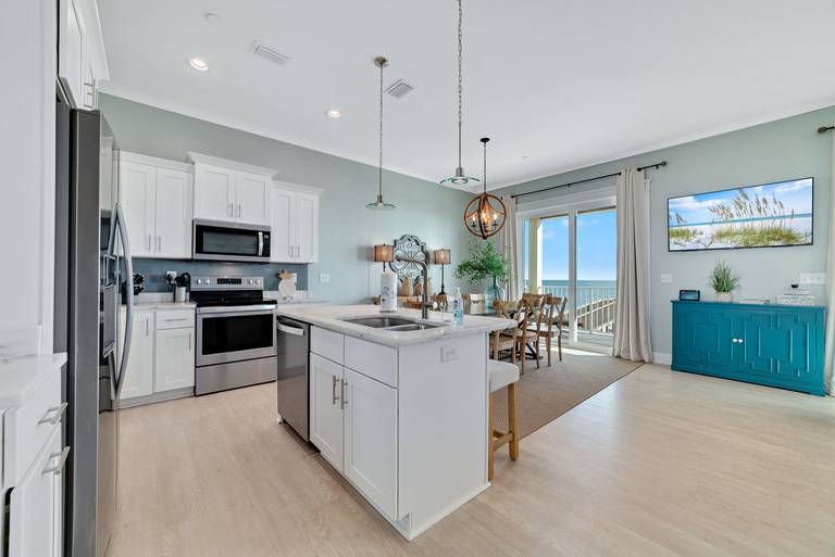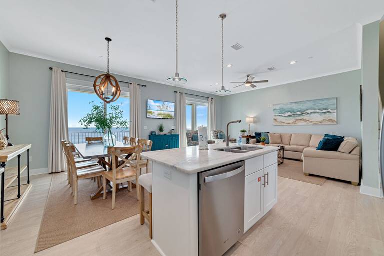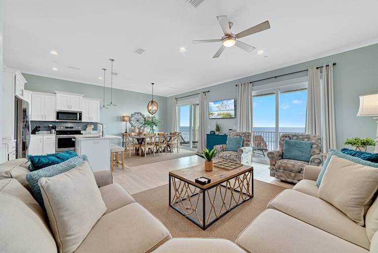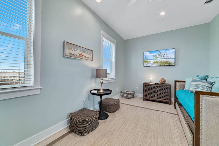 This spacious property features 5 bedrooms, including 4 beachfront king rooms and a bunkroom that sleeps 4. The first floor includes the living room, dining room, kitchen, and a full bathroom. On the second floor, you'll find the bunkroom with a twin-over-twin bunk bed and twin daybed with a trundle, along with 2 king bedrooms. The third floor offers 2 more king bedrooms and another living area with a daybed and a trundle. Each floor boasts wide porches with breathtaking gulf front views.