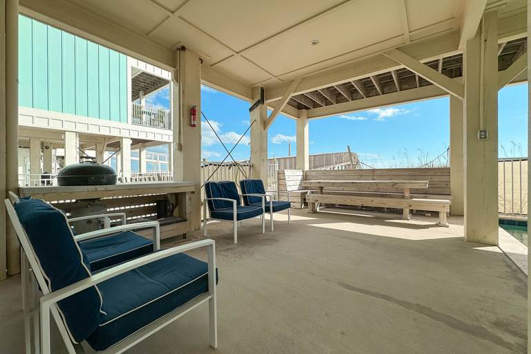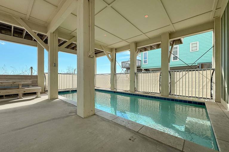 The stylish decor and clean lines of Pineapple Paradise complement the expansive ground-floor space, featuring a custom 12' x 25' gunite pool (heated from October to May for $60 per day), a charcoal grill, an outdoor dining table, and plenty of shaded space to unwind after a day at the beach. Located approximately 3.7 miles west of Highway 59, this home offers a quiet and uncrowded setting, just minutes away from local restaurants and shops. This property is not available for rental to groups under the age of 25 or for bachelor or bachelorette parties. For the Hangout Music Festival, a $1000 refundable damage/cleaning deposit is required to ensure the property is maintained as expected.