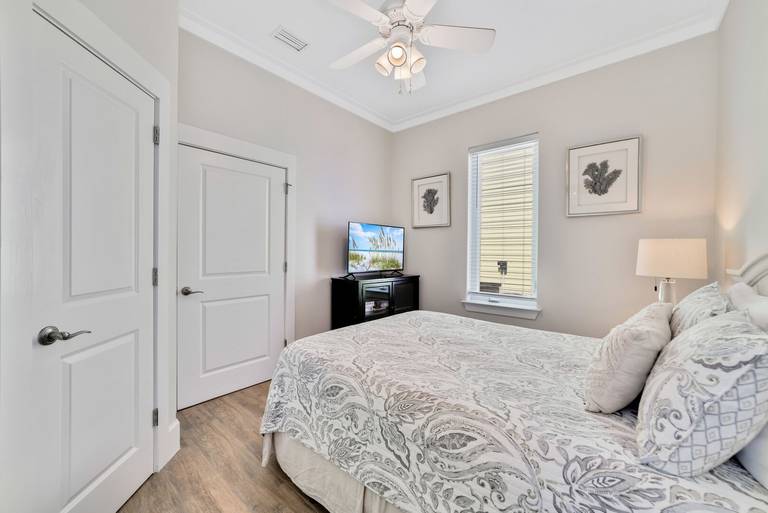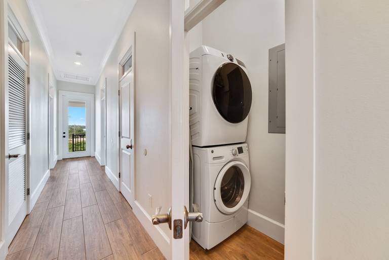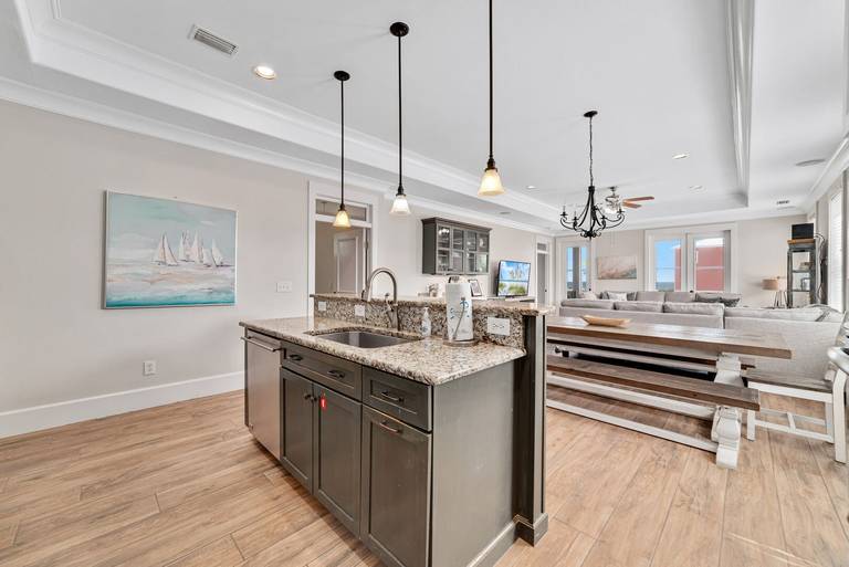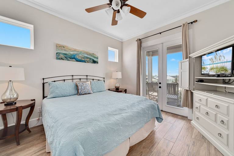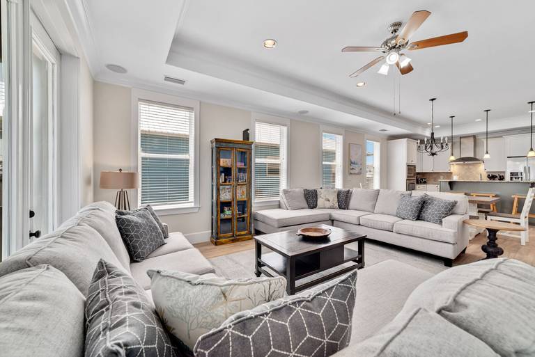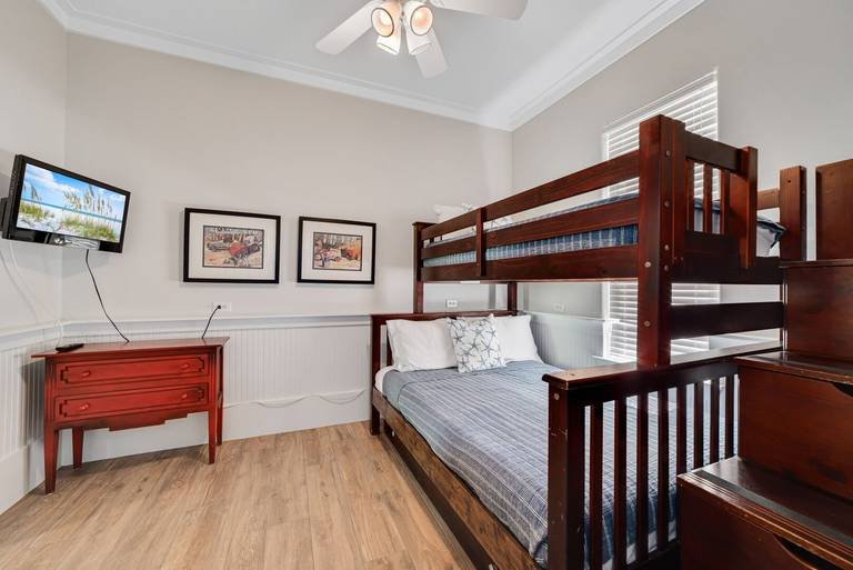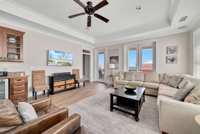 The bright Great Rooms form the main social area with a Smart TV. A wet bar with stand-alone ice maker and wine refrigerator awaits you in preparation for that perfect vacation libation. Each bedroom is equipped with its own bathroom and television. Each level has three master bedrooms with king-sized beds and private balcony access. Each level also has a room for kids to call their own during their stay. An elevator connects all levels together with the ground floor for ease of use.