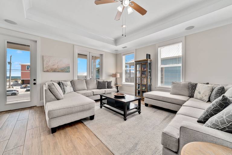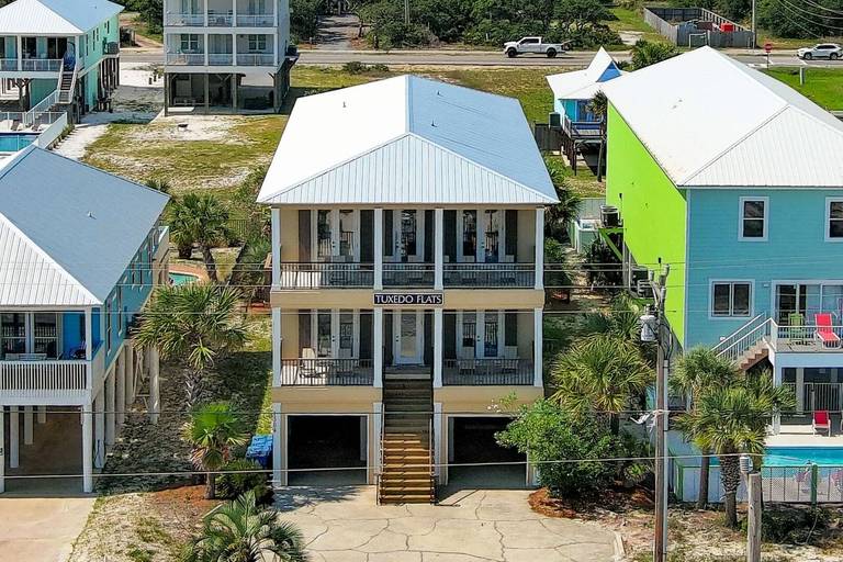 [2350]Tuxedo Flats is a 10 bedroom, 10 full and 2 half bath home conveniently located just across from the 12th Street beach access. Each of the 2250 square foot floors has 5 bedrooms, 5.5 baths plus a living and dining area a full kitchen and a wet bar, plus porches on both the beach and pool sides of the house. There are stairs and an elevator connecting the floors, and you can close the doors to the stairs to increase privacy between the two levels if you wish.